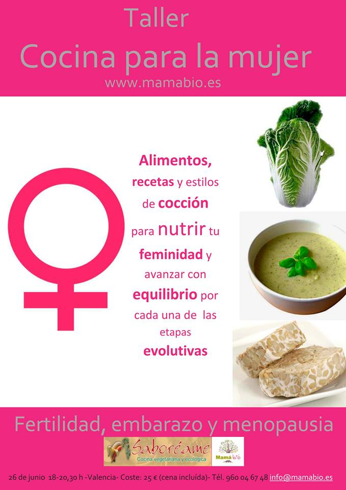 Os invitamos a participar este jueves 26 de Junio en el interesante Taller de Cocina para la Mujer, organizado por Restaurante Saboréame –Km0 Slow Food Valencia- y Mama Bío, Escuela de Nutrición de Mercedes Morales, para explorar los alimentos, recetas y estilos de cocción para alcanzar una óptima nutrición y equilibrio en cada una de las etapas de la vida de la mujer: fertilidad, embarazo y menopausia.