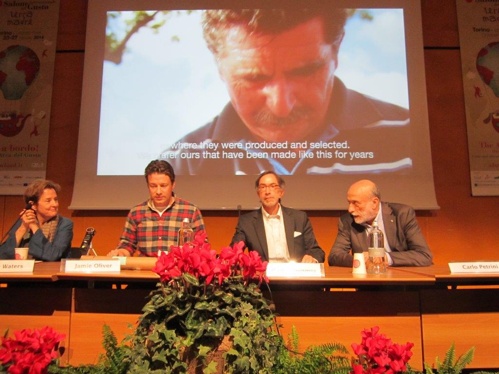 Carlo Petrini expresó durante la conferencia que él es un “…apasionado de personas como Gastón Acurio, Jamie Oliver y Alice Waters porque cada día pasan a la acción, comprometidos con cambio del actual modelo alimentario criminal que destruye la biodiversidad, el medio ambiente y la convivialidad…”