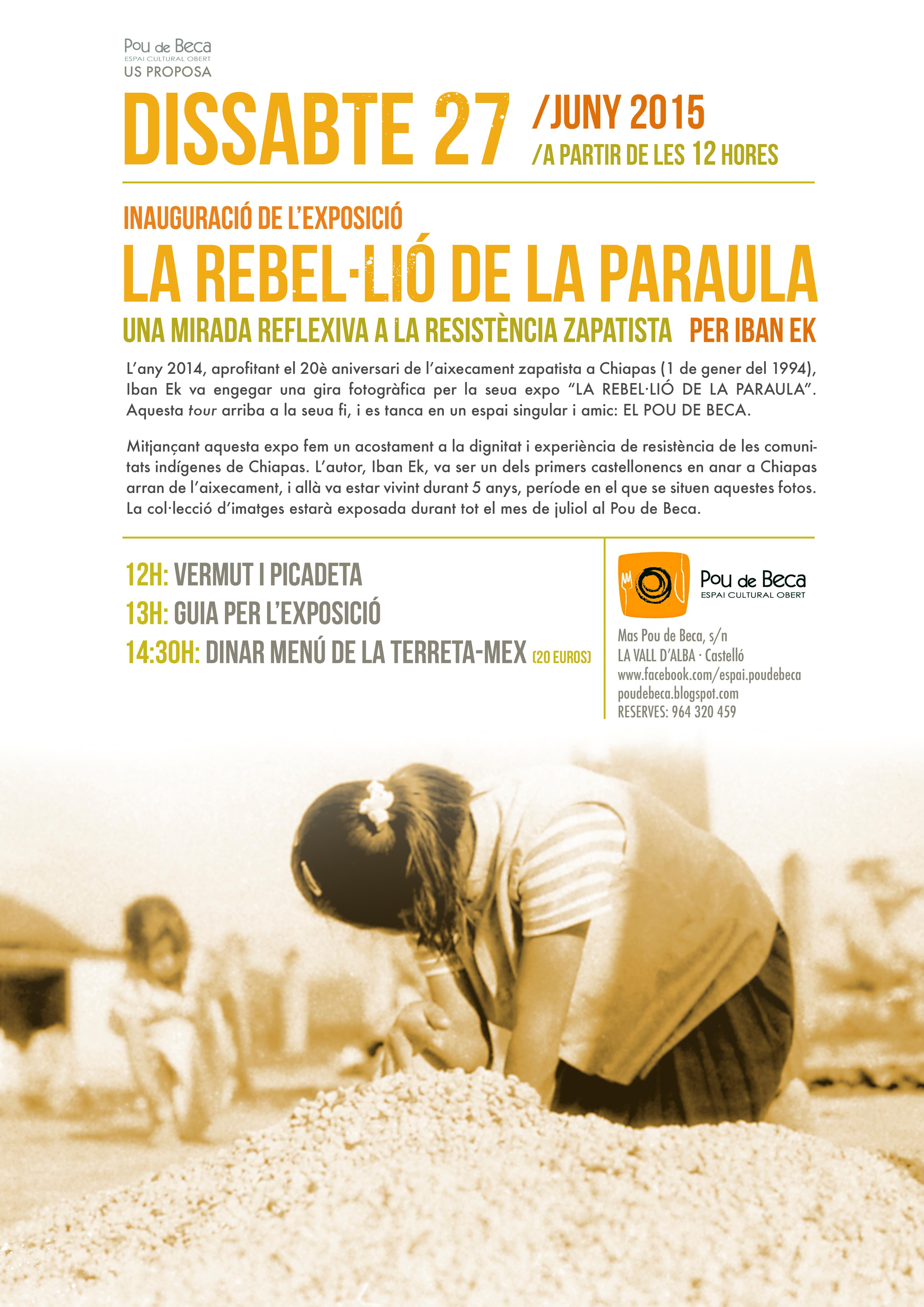 Després de Castelló, UJI, Borriana, Barcelona, Premia de Mar, Iruña, Bilbo, Ermua i Berlín en el darrer any 2014, a 20 anys des de l’aixecament zapatista, i Madrid, Sagunt, València, Castelló, Morella i Barcelona en 2008…, la exposició sobre els meus 4 anys a Mèxic, La Rebel·lió de la Paraula, ha arribat a la seva fi, tanquem la gira expositiva el proper 27 de juny a les 12h en el Restaurant-Espai Cultural Pou de Beca en Vall d’Alba, enmig d’armelers i oliveres, arrels de la meva terreta per acabar un dels treball fotogràfics més profunds i extens que he fet mai, sobre la meva segona casa, Chiapas-Mèxic.