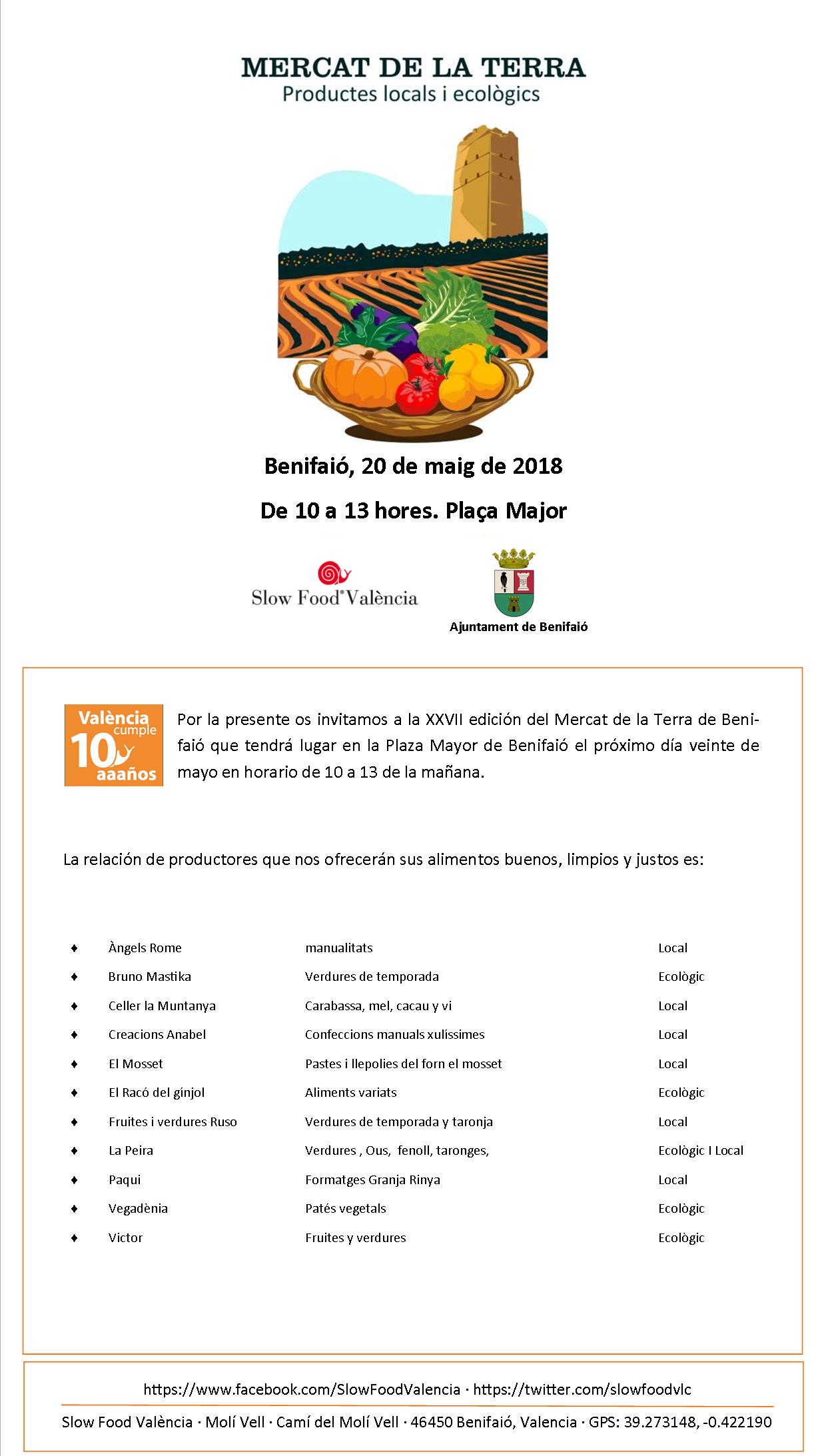 Por la presente os invitamos a la XXVII edición del Mercat de la Terra de Benifaió que tendrá lugar en la Plaza Mayor de Benifaió el próximo día veinte de mayo en horario de 10 a 13 de la mañana.