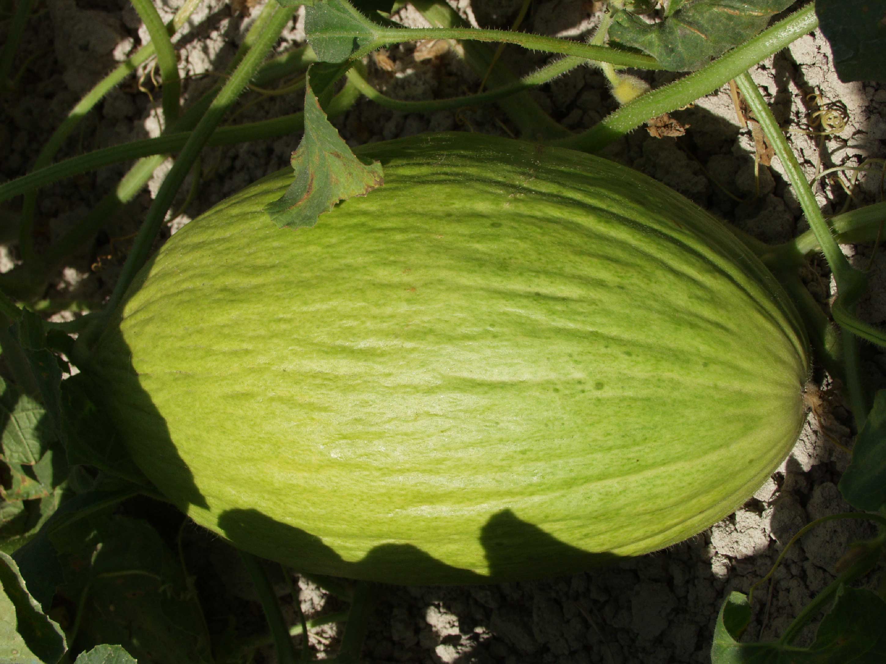 Es un melón con piel rugosa de diferentes tonos de verde y de forma alargada, cual pelota de rugby, de carne dura y crujiente en su juventud y meses después se reblandece